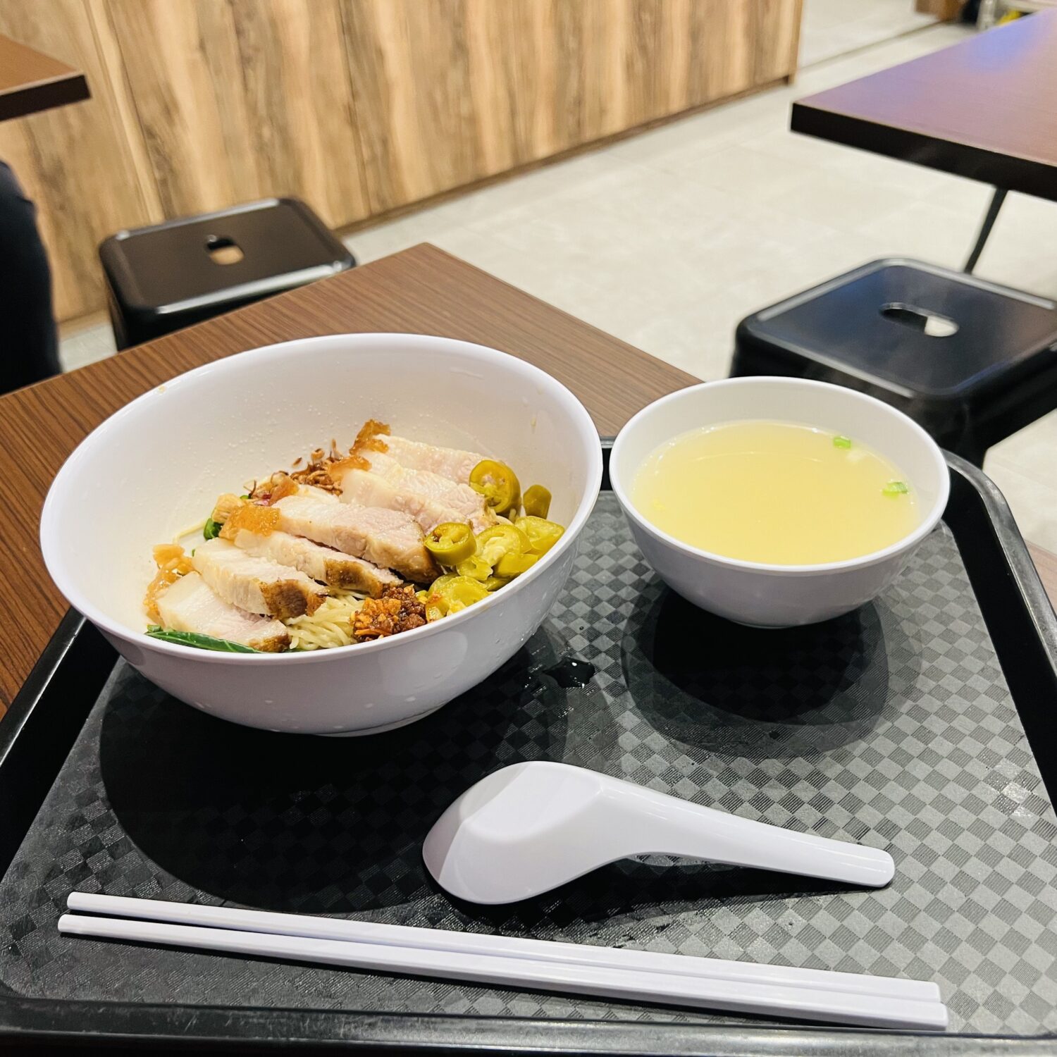 コロミーの特徴は、スープを使わず、麺そのものの食感とタレの香りを楽しむ点にあります。タレは濃すぎず、後味が重くならないよう調整されていて、朝食や軽めの食事にも食べやすい料理です。盛り付けられる具材には、チャーシュー、カリカリ豚肉、ひき肉、揚げエシャロット、青菜などが使われることが多く、全体としてシンプルにまとめられています。