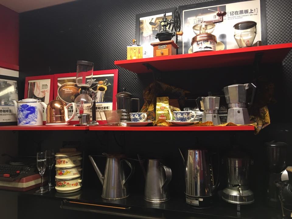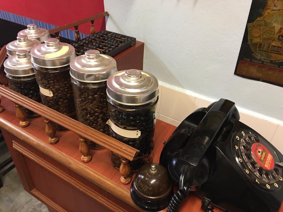 店内の隅にはコピ博物館もあり、コピに使われる豆や器具が置かれています。