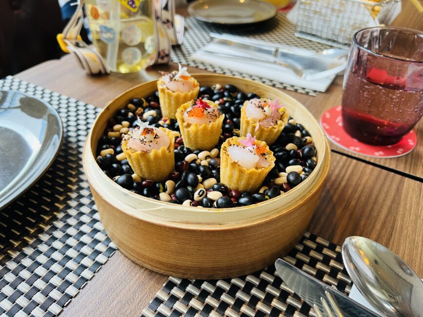 カップの部分は米粉と小麦粉を混ぜて作られた薄い生地を専用の型(パイ・ティーカップ)で揚げたもので、カリっとしつつ軽い食感が特徴です。中には細かく刻んだ大根(またはサツマイモ)と人参を炒めた具を詰め、上からエビや揚げたエシャロット、チリソース、パクチーなどを添えます。ひと口サイズながら、食感、香ばしさ・甘み・辛みが混ざったユニークな料理になっています。